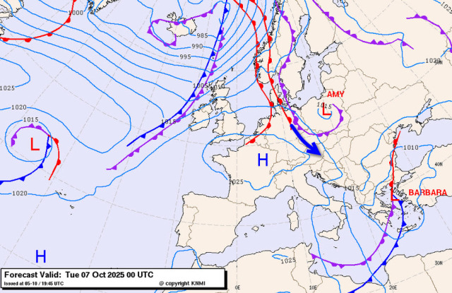 De Atlantische stormdepressie ligt ondertussen uitgeblust boven Polen. Het systeem heeft nog wel enige invloed op Oostenrijk. Hier valt vanaf ongeveer 2300 à 2400 meter lokaal nog wat sneeuw. @KNMI