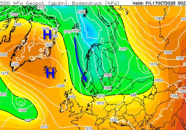 Donderdag trekt een nieuwe stormdepressie van IJsland richting Scandinavië. De actieve neerslag trekt dan vanwege luchtdrukstijgingen boven het Europese continent ruim ten noorden van de Alpen langs. Toch sluit ik enkele lichte regenbuien in het noordWestelijke Alpengebied niet uit. Daarna zorgt een opbouwend hogedrukgebied boven het Verenigd Koninkrijk voor enige stabilisatie. Dit betekent voor de Alpen een weersverbeterering. Een Goldener Oktober weertype lonkt. Daarna zijn er signalen op enige afkoeling. Het hogedrukgebied verplaatst zich midden oktober waarschijnlijk wat meer richting IJsland en Groenland waardoor er hogerop een noordelijke koude stroming op gang komt. In hoeverre deze de Alpen gaat beïnvloeden valt in dit stadium nog niet te zeggen. We wachten het geduldig af.
