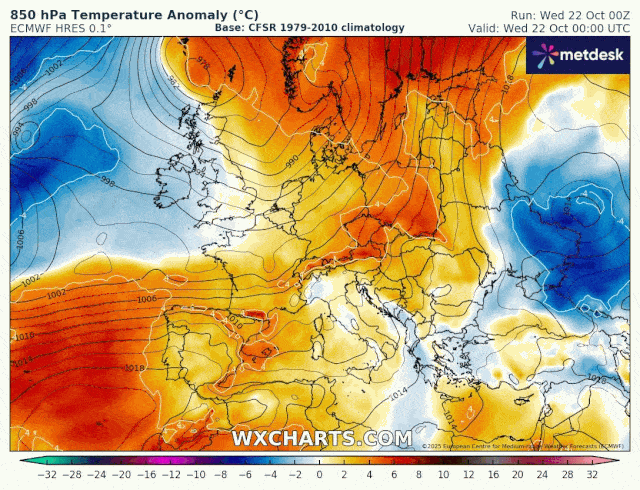 De temperaturen op het 850hPA vlak (T850hPA)corresponderen met een hoogte van 1400 tot 1500 meter.