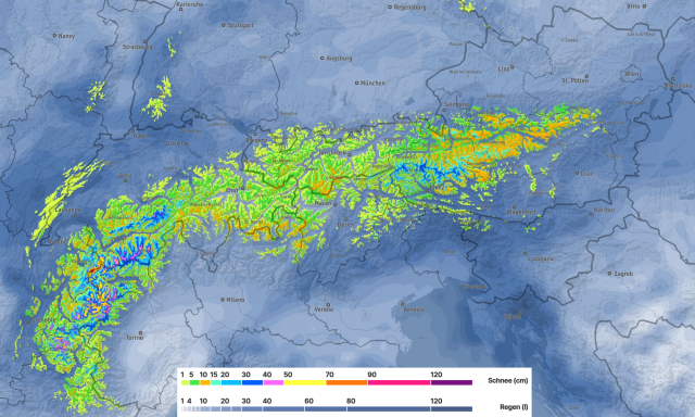 Vanavond wordt het tijdelijk droger, maar rond middernacht zal het alweer beginnen te regenen in de Westelijke Alpen. Deze keer op nadering van een koufront met toenemende stuwing (W-stau). Morgen overdag breidt deze neerslag, gedreven door een forse wind, uit naar het oosten van de Alpen, via zowel de zuid- als noordkant. Aan de achterzijde verschijnen er na de middag alweer opklaringen vanuit Frankrijk. De sneeuwgrens ligt aanvankelijk rond 2800 m, maar zakt in de loop van de dag fors en snel tot 1500-1600 m. Morgenavond en tijdens de nacht op vrijdag buldert de dieppolaire lucht dan binnen en zakt de sneeuwgrens verder tot 1100-1300 m. Tegelijk krijgt de neerslag langs de noordkant dan een nieuwe impuls met stevige sneeuwbuien tussen pakweg de Vanoise en Vorarlberg (NW-stau). De zuidkant houdt het dan wel droog en ligt begunstigd met brede opklaringen. De wind zal morgen ook aanspannen, met in de bergen rukwinden tot 100-140 km/u. De felste rukwinden zijn voor de West-Italiaanse Alpen (hier zou 150 km/u bereikt kunnen worden). Tegen vrijdagochtend kan er in de Westelijke en NoordWestelijke Alpen 30-50 cm sneeuw vallen. Elders langs de noordkant is dat eerder 10-20 cm. Langs de zuidkant blijft het bij centimeterwerk als de sneeuwgrens morgen snel genoeg daalt.