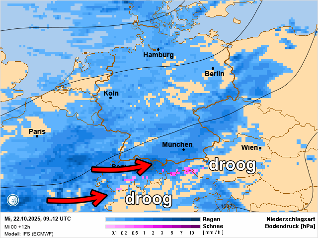 Het sturende lagedrukgebied heeft vandaag weer een wat meer westelijke positie, waardoor de Alpen zich in de "warme sector" bevinden, met aanvoer van zachte lucht uit het zuidwesten. Morgen verandert dit met een randlagedrukgebied dat via de Noordzee naar de kusten van Denemarken schuift. De polaire lucht krult rondom dit laag en valt morgen namiddag binnen in de Alpen. Tijdens het weekend en begin volgende week blijft het lagedrukgebied rondhangen boven het zuiden van Scandinavië en liggen de Alpen aanhouden in de polaire lucht, aangevoerd vanaf het west-noordwesten. Een langere periode met wat lagere temperaturen en sneeuwkansen dient zich aan.