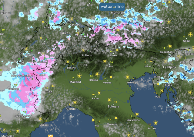 Vooral in de Westelijke Alpen kunnen er vandaag nog intensere sneeuwbuien vallen, maar ook elders langs de noordkant is nog een bui mogelijk. @Wetteronline