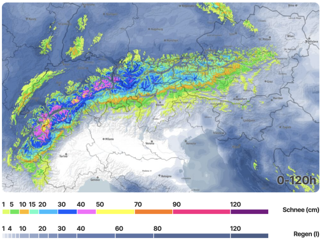 Vannacht en ook morgen blijven de Westelijke en Noordelijke Alpen gevoelig voor enkele buien. Morgen namiddag arriveert een meer uitgestrekt neerslaggebied door een trog die op de Alpen botst. De sneeuwgrens stijgt daarbij wel tot 1500 m in het oosten en 1800 m in het westen. In de lagere regio's zal een eventuele sneeuwlaag dus wel weer wegsmelten. Langs de zuidkant blijft het aanhoudend droog met brede opklaringen. Hier klimt de vorstgrens morgen, geholpen door wat föhn, tot 2600-2800 m. Weinig verandering op zondag, behalve dat de aangevoerde lucht vanaf het westen en noordwesten weer kouder wordt. De buien langs de noordkant kunnen daardoor opnieuw onder vaste vorm vallen vanaf 1000 m. Ook zondag verloopt volledig zonnig aan de zuidkant. Een groot contrast dus!