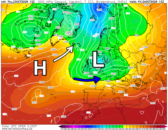 T500 hPA geeft de temperatuur weer op circa 5 kilometer hoogte