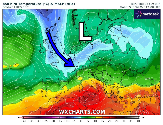 T850 hPa geeft de temperatuur weer op een hoogte van circa 1500 meter.