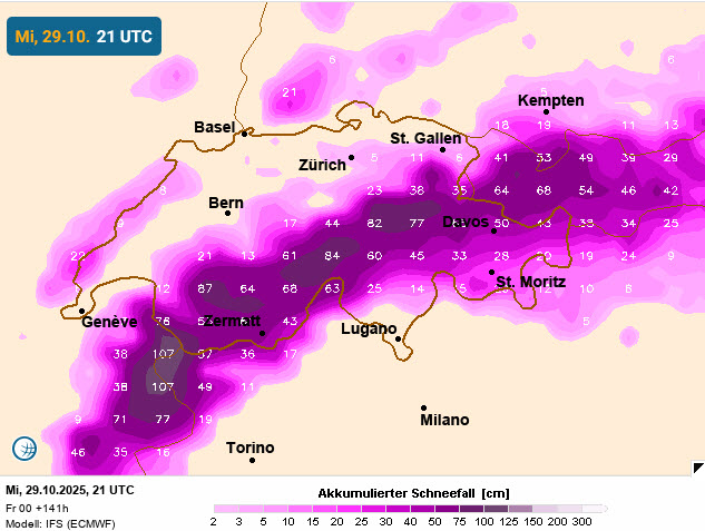 Zondag schakelt het oktober wintertje in een nog hogere versnelling. De Alpen komen dan vanuit het noordwesten nog wat dieper in de polaire luchtmassa terecht. DIt zien we duidelijk aan de sneeuwgrens terug. Die daalt namelijk zelfs richting een mooie 1000 meter grens. Hoe leuk is dat! Niet slecht voor eind oktober. Nu is het niet overal feest wat de sneeuw betreft. Deze richt zijn pijlen namelijk wederom op de Franse en Zwitserse noordwestelijke stauhellingen. In deze regionen valt met gemak een mooie 15 tot 30cm sneeuw.