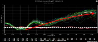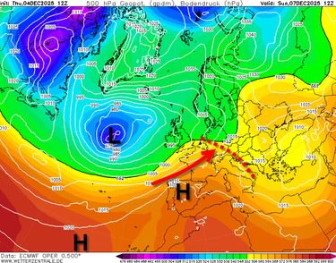 Er valt niet aan te ontkomen. Het vervelende warmtefront van zondag. Het komt niet onverwachts natuurlijk. Maar leuk is anders. Hogedruk van de Azoren met een uitloper tot over Spanje geeft een portie subtropische lucht een flinke zwieper richting West en Midden-Europa. Eigenlijk doet die uitloper tot over Spanje ons warm de das om. De warme sector ligt daardoor breed over Europa, met alle warme gevolgen van dien. Zondagochtend begint het in de Franse Alpen te regenen en te sneeuwen. De sneeuwgrens stijgt met het instromen van de zachte luchtmassa al snel richting de 2500 meter. In het hooggebergte valt in het westen met gemak 30 tot lokaal zelfs 50cm sneeuw. Daaronder is het een ordinair waterballet. Ik kan er helaas niet meer van maken. De krachtige tot harde westelijke wind is ook een negatieve factor. Het bevordert het smeltproces op de lagere niveau's. Hopelijk valt de schade mee. De neerslag breidt zich in de ochtend snel via de Zwitserse noordzijde richting de Bayerische Alpen en Oostenrijkse Alpen uit. Hier ligt de sneeuwgrens met ongeveer 2200 meter wel een fractie lager. Maar ook hier gaan de pistes lijden onder de subtropische aanval.