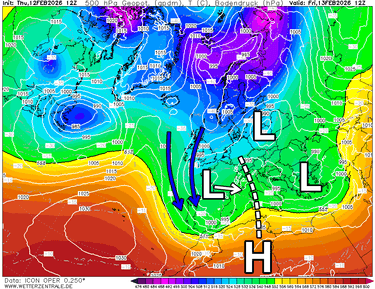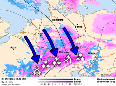 Vanavond en vannacht valt er in de Zuidelijke Franse Alpen en in de westelijke binnenboog (Piemonte) wat lichte sneeuw. De sneeuwgrens ligt rond 800-1000 m. Elders blijft het droog met veel bewolking en enkele opklaringen. Morgen overdag blijft het langs de zuidkant bewolkt waarbij de lichte sneeuw zich stilaan wat meer naar het oosten uitbreidt. De intensiteit ligt eerder laag, maar er dus wel wat sneeuw vallen. Aan de noordkant van de Alpen blijft het morgen voormiddag nog droog. Na de middag begint de polaire lucht vanaf het noordwesten wat meer te stuwen en ontstaat er ook aan deze zijde van de Alpen sneeuw. Aanvankelijk vooral in Frankrijk en in het westen van Zwitserland, maar tegen het einde van de namiddag en 's avonds ook uitbreidend naar Oostenrijk. Ook in het zuiden van Duitsland valt er tijdens het tweede deel van de namiddag lichte sneeuw. De beperkte intensiteit en latere timing zou een geluk kunnen zijn voor de belangrijke reisdag. met de binnenstromende polaire lucht zakt de sneeuwgrens uiteindelijk onderin. Voor alle reizigers, vroeger vertrekken lijkt de boodschap, al zijn de sneeuwhoeveelheden mogelijk wel beperkt genoeg om het verkeer niet al te veel te beïnvloeden.