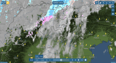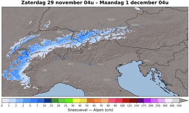 Morgen verloopt nog lange tijd droog met een mix van zon en hoge/middelhoge wolkenvelden. Vaak kan de zon daar nog wel doorheen schijnen, vooral langs de zuidkant en in het oosten, maar soms liggen de hogere toppen ook onder de bewolking. Het naderende front vanaf Frankrijk is een koufront met stilaan weer wat lagere temperaturen. De vorstgrens in het oosten klimt tot 2200-2400 m, in het westen tot 1800-2000 m. De wind zal in de loop van de dag ook wat meer aanspannen. Na de middag neemt de bewolking verder toe in het westen maar pas 's avonds (laat) arriveert de eerste neerslag in de Westelijke en Noordwestelijke Alpen. Deze neerslag breidt zich vervolgens tijdens de nacht op maandag traag uit langs de noordkant naar Oostenrijk, om daar maandagochtend op te lossen. De sneeuwgrens daalt tijdens de neerslag, door het binnenstromen van opnieuw koudere lucht, van 1000 tot 600 m. Er kan 2-10 cm sneeuw vallen.