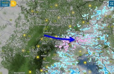 In Oostenrijk start de dag aan de voorzijde van het koufront nog vrij vriendelijk met redelijk wat zon. De krachtige tot harde zuidelijke wind veroorzaakt aan de noordzijde in eerste instantie voor wat föhn verschijnselen. Later in de middag bereikt het koufront het westen van Oostenrijk met regen en sneeuwbuien. Zoals het er nu naar uitziet zijn de buien voornamelijk in de Arlberg en westen van Tirol actief. Verder oostelijk gaat de fut er duidelijk wat uit. De sneeuwgrens daalt in de Arlberg naar ongeveer 900 à 1100 meter. De Dolomieten maken tevens later op dag kans op enkele binnentrekkende sneeuwbuien / sneeuwgrens rond de 1400 à 1600 meter.