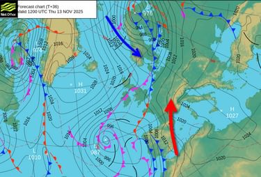 Maandag is het eindelijk zover. Het wordt dan vanuit het noordwesten gevoelig kouder. De sneeuwverwachting voor de noordzijde is echter nog een groot vraagteken. De verwachting is erg springerig, afhankelijk van snelle luchtdrukstijgingen vanuit het zuidwesten. Als dit proces te snel verloopt, komt er van de sneeuwval niet al teveel terecht. Lander beoordeelt morgen hoe dit proces zich verder ontwikkeld.