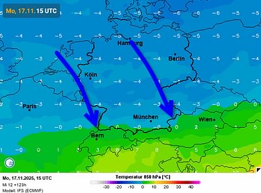 De weerkaarten liggen nog steeds zacht op slot. Het brongebied van de aangevoerde lucht in de Alpen is Noord-Afrika. Een koude verrassing uit deze geografische hoek is natuurlijk onmogelijk. Opvallend detail is de intensieve regen boven Portugal en het westen van Spanje. Een langgerekte neerslagzone verplaatst zich evenwijdig aan de bovenstroming. Deze omgeving krijgt daardoor te maken met langdurige regen. We noemen dit in vakjargon een slepend front. Laat maar komen, zou je zeggen, maar dan wel in een koude variant. Er zijn gelukkig wel voldoende koude aanknopingspunten voor de Alpen. Maar zover is het nog niet. De regio moet eerst afrekenen met de huidige milde fase, want warm is het in de Alpen, met een vorstgrens die ergens schommelt tussen een hoge 3400 à 3800 meter.