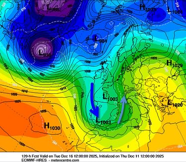 Maandag oogt eveneens zonnig. In de Westelijke Alpen drijft langzaam wel wat meer bewolking binnen. Dit heeft te maken met een hoogte trog die ruim ten westen van de Alpen via Spanje richting de Balearen trekt. Hierdoor is er rond dinsdag een toenemende kans op sneeuw in het zuidwesten. Maar niet voor Oostenrijk en de gehele noordzijde. Daarvoor ligt de trog veel te westelijk. De aanvoer ligt op hoogte tevens vanuit het zuidwesten. De noordkant is dan zogenaamd Wetterbegünstigt. Zoals het er nu naar uitziet concentreert de sneeuw zich tegen die tijd op de Frans/ Italiaanse Seealpen, Ligurische Alpen, Aosta en zuiden van Wallis. De sneeuwgrens ligt volgens de laatste prognoses ergens rond de 1400 à 1800 meter.