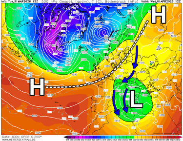 Vrijdag verloopt zeer gelijkaardig. Veel zon in het westen en langs de zuidkant, en een mix van lage wolken en stilaan meer zon in het oosten. Het blijft dan wel droog. De vorstgrens gaat overal 200-300 m de hoogte in, tot pakweg 1600-2500 m. Zaterdag is het in de Oostelijke Alpen eerst vaak bewolkt, met kans op een bui. De sneeuwgrens ligt dan rond 1400 m. In het westen en langs de zuidkant is het meteen zonnig. Overdag breiden de zonnige periodes stilaan uit naar het oosten, tot het 's avonds grotendeels helder wordt. In het zuidwesten klimt de vorstgrens ondertussen tot 2600-2800 m. Er sluipt dus stilaan zachtere lucht binnen. Pasen lijkt dit jaar zonnig te verlopen in de Alpen. Er komen wat hoge wolkenvelden voor, maar daar weet de zon wel raad mee. Op 850 hPa klimt het kwik tot 10-12°C, dus de vorstgrens ligt tussen 2500 en 3000 m. Ook begin volgende week lijkt het droog en vaak zonnig te zijn met hoge temperaturen. De komende dagen dus optimaal genieten van het late winterweer!