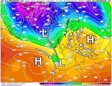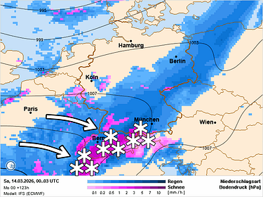 Woensdag zorgt een vlakkere luchtdrukverdeling voor licht onstabiel weer. Vooral langs de zuidkant van de hoofdkam kunnen er dan enkele buien gevormd worden. Het weerbeeld wordt overdag wisselend bewolkt met een mix van zon en stapelwolken. 's Avonds, tijdens de nacht op donderdag en ook nog donderdagochtend zorgt een koufront vanaf het westen voor meer bewolking en neerslag. In eerste instantie zijn de Franse Alpen aan de beurt, en tijdens de nacht op donderdag breidt de neerslag via de noordkant uit naar het oosten (tot aan Vorarlberg). Het is de eerste frontale neerslag sinds lange tijd. De sneeuwgrens ligt eerst rond 1400 m, maar zakt al snel tot 1000-1200 m en mogelijk nog wat lager. Ik verwacht 5-10 cm, lokaal wat meer in de Franse Alpen. Overdag wordt het snel droger, maar de Oostelijke Alpen blijven nog wel een hele tijd kampen met meer wolkenvelden. In het westen klaart het al sneller op. Woensdag en donderdag ligt de vorstgrens tussen 1800 en 2400 m. Dat is niet te hoog voor de tijd van het jaar. Vrijdag krijgt de zuidkant meer bewolking en enkele verspreide buien. Aan de noordkant blijft het dan droog en zonnig. Zaterdag zou een vrij actieve neerslagzone vanaf het westen voor sneeuw van betekenis kunnen zorgen. Eerst zijn de Franse Alpen aan de beurt, maar nadien schuift de neerslag via de noordkant door naar het oosten. An de zuidzijde kan er een tijdelijke Südstau ontwikkelen door een zogenaamde "gegenströmung". Jackpot time? De sneeuwgrens zou wel eens onderuit kunnen gaan tot 500 m en in veel regio's tonen de weermodellen momenteel 20-40 cm sneeuw. Mooie vooruitzichten op deze maandag. Fijne dag en graag tot morgen!