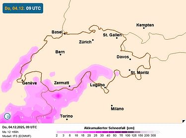 Het blijft vandaag met uitzondering van de zuidelijke Italiaanse Seealpen overwegend droog. In deze omgeving valt uit de wat dikkere bewolking af en toe wat lichte regen of sneeuw. Het gaat om maximaal 5cm. Grote hoeveelheden zijn deze keer niet aan de orde. Vanwege het geringe luchtdrukverschil staat er er tevens niet al teveel wind. Ten noorden van de hoofdkam is de aangevoerde lucht duidelijk wat droger. De kans op zon is daar dus wat groter. Vooral in de Bayerische Alpen, Zillertaler Alpen in de richting van de Tauern komt de zon prima voor de dag. De temperatuur is ondertussen wel wat opgelopen. De vorstgrens ligt vandaag rond of zelfs net iets boven de 2000 meter.