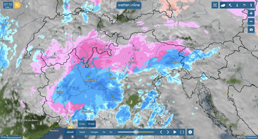 Overdag blijft het wisselvallig. De Südstau verplaatst zich verder naar het oosten, met nog lange tijd sneeuw van betekenis langs de oostelijke zuidkant, vooral in de Dolomieten. Deze neerslagimpuls grijpt ook over naar de noordkant met na een droge start ook sneeuw in Oostenrijk. In de Westelijke Alpen is het voor de middag eventjes wat droger, maar al snel zal de wind hier naar het noordwesten draaien en ontstaat er een Nordweststau met een nieuwe neerslagimpuls. Langs de westelijke zuidkant klaart het na de middag, aan de lijzijde, wat meer op. De vorstgrens ligt vandaag tussen 1000 en 1400 m aan de noordkant, en 1600-2000 m aan de zuidkant.