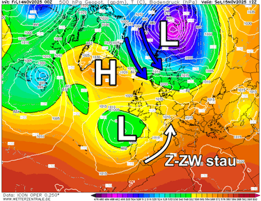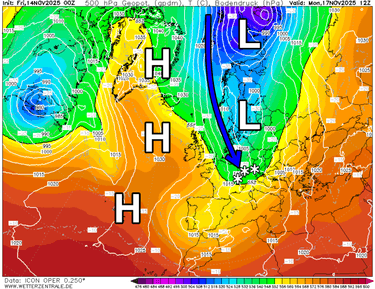 Zondag krijgt het weercontrast een verlengstuk. De noordkant houdt het vrijwel droog met mooie föhnopklaringen. Langs de zuidkant en gedeeltelijk ook de Westelijke Alpen is het betrokken en valt er stuwingsneerslag. Ik verwacht dat de sneeuwgrens wel wat zal zakken, tot 1800-2000 m. Tijdens de nacht op maandag lijkt er vooral in de Dolomieten regio neerslag van betekenis kunnen vallen, met dan een sneeuwgrens zakkend tot 1600 m. Mooi! Maandag ontwikkelt er dan een interessante luchtdruksetting. Een hogedrukgebied werpt zich Z-N op boven de Atlantische Oceaan, met een as die zich uitstrekt van de Azoren tot bij Groenland. Het bastion van lagedruk dat zich in deze tijd van het jaar vaak rond de Noordpool bevindt splits zich in twee delen, met een deel dat naar Noord-Amerika beweegt en een deel dat naar Noord-Europa schuift. Uiteindelijk ontwikkelt hieruit een diepe lagedruktrog over Noord- en West-Europa met aanvoer van polaire en zelfs arctische lucht. Zodra deze koude lucht op de Alpen botst, en dat lijk maandag namiddag te gebeuren, ontstaan er langs de noordkant neerslag van betekenis. Met het binnenstromen van de polaire lucht kan de sneeuwgrens dan zakken tot 600 m. Eindelijk actie in de Alpen! We volgen het de komende dagen verder op :)