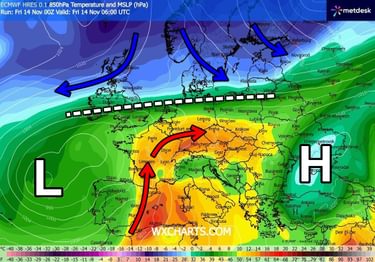 Een naderend lagedrukgebied, Claudia gedoopt, schuift wat dichterbij van over de Atlantische Oceaan. Het Europees hogedrukgebied blijft echter stevig voor anker liggen waardoor het weerbeeld vandaag nog weinig veranderd. De zogenaamde warmtepomp staat nog volop aan en het blijft droog. Komende dagen wordt de luchtdrukverdeling meer vlak, en dat zorgt meteen voor wat neerslagkansen en enige afkoeling. Volgende week staat dan in het teken van een echter winterinval met sneeuw. Hogedruk kiest positie bij IJsland/Groenland. Ten oosten daarvan zal een diepe lagedrukdroog voor aanvoer van polaire/arctische lucht zorgen naar Europa.
