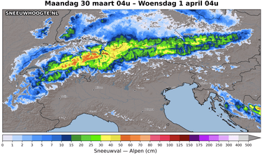 Vannacht en morgen valt er langs de centrale en oostelijke noordkant aanhoudend sneeuw met een actieve Nordstau. De centimeters zullen snel aandikken, met een sneeuwgrens die helemaal onderin ligt. Het blijft in deze contreien ook volledig betrokken. Langs de westkant is er weinig of geen stuwing aanwezig. Hier start de dag morgen veelal bewolkt, maar klaart het overdag stilaan op. Net als vandaag krijgen de Zuidelijke en Italiaanse Alpen morgen een topdag met volop zon. Grote contrasten dus. Sneeuw in het noorden, zon in het zuiden. Vorig jaar en het jaar voordien was het vaak anders aan het einde van de winter. Morgen zal de wind meer naar het noorden ruimen en blijft het aanhoudend fors doorwaaien. De felste rukwinden zijn voor de centrale en oostelijke noordkant met hier tot 90-100 km/u. In het westen wordt het iets rustiger. Tot en met morgenavond verwacht ik in het westen 2-5 cm, langs de Zwitserse en Oostenrijkse noordkant is dat maar liefst 40-50 cm. Inner-alpien valt 10-25 cm poeder, maar wel sterk verwaaid.