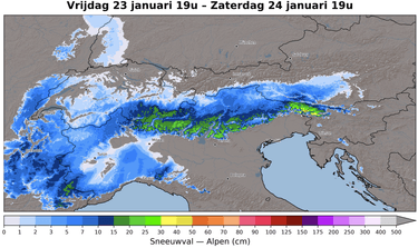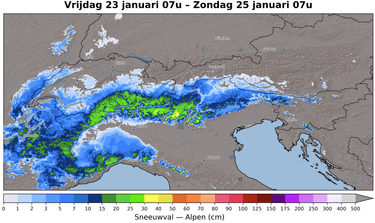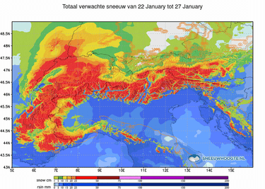 Tijdens de nacht op zondag breidt de neerslag vanaf de Zuidelijke Franse Alpen via de zuidkant weer uit naar het oosten, zodat een groot deel van de Italiaanse Alpen weer sneeuw krijgt. Opnieuw is een 5-10 cm sneeuw wel mogelijk, op sommige plaatsen ook minder. Zondag voormiddag is er ook wat overgrijpende sneeuw mogelijk in Oostenrijk. Ten westen van Salzburg is een aantal cm mogelijk. Maandag wordt een kwakkeldag met wat sneeuwbuien in de Westelijke en Noordelijke Alpen. Algemeen verwacht ik hiervan geen grote hoeveelheden. Dinsdag en woensdag buldert een nieuw neerslaggebied naar de Alpen met eerst sneeuw in de Franse Alpen, vervolgens ook uitbreidend naar het oosten via de zuid- en noordkant. In eerste instantie gaat de sneeuwgrens omhoog tot 1400 m in het westen, maar al snel stroomt er weer koudere lucht binnen en zakt de sneeuwgrens weer enkele honderden meters. Cumulatief zou hierbij in de Westelijke Alpen wel eens 30-50 cm sneeuw kunnen vallen, langs de zuidkant 20-40 cm en langs de noordkant 10-20 cm. Dat zijn hoeveelheden die we kunnen gebruiken. Afwachten of dit de komende dagen op de weerkaarten aanwezig blijft. En eerst vandaag en dit weekend binnenhalen wat er valt. Sneeuw komt er aan!