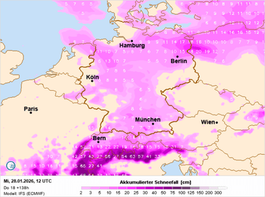 Vandaag begint nog droog. In het westen en oosten hangen er vrij veel middelhoge wolkenvelden, maar langs de centrale noordkant is het wel zonnig. De zuidkant heeft te maken met een mix van lage wolken en opklaringen. In de loop van de (voor)middag zal de bewolking vanaf het zuidwesten stilaan verdichten en na de middag zal er dan ook stuwingsneerslag ontstaan. Het eerst in de Alpes Maritimes (Frankrijk), nadien uitbreidend richting O-NO langs de zuidkant en de Westelijke Alpen. De sneeuwgrens ligt in het westen rond 1000 m, en zakt aan de zuidkant tot helemaal onderin. Oostenrijk heeft vandaag duidelijk het beste weer met na het optrekken van de middelhoge wolkenvelden alweer een hele dag vrij zonnige omstandigheden. Met wat ZW-föhn klimt de vorstgrens hier tot 2200 m, terwijl dit in het westen 1800 m is, en langs de zuidkant 600-1200 m. De sneeuw trekt vannacht via de zuidkant verder door naar het oosten en verlaat dan morgenvoormiddag de Alpen. In de Zuidelijke Franse Alpen en oostelijke zuidkant valt de meeste sneeuw met 15-25 cm. Elders in de Franse Alpen en de zuidkant (onder andere Dolomieten is dat 5-10 cm, en wat minder hoe meer inner-alpien). Elke sneeuw centimeter is meegenomen! De Walliser Alpen en het Berner Oberland krijgen 1-5 cm, de Oostenrijkse noordkant houdt het droog. De wind uit Z-ZW zal vandaag ook stilaan wat meer toenemen.