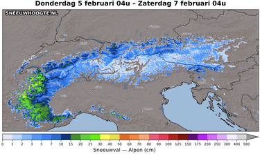 Tijdens de nacht op woensdag duwt een stormachtige westenwind de neerslag via de noordkant naar het oosten, met een sneeuwgrens dan rond 1200-1400 m. Mogelijk (eindelijk) weer neerslag van betekenis dus voor de Oostenrijkse noordkant. Donderdag en vrijdag blijft het zeer wisselvallig met veel neerslag langs de west- en noordkant. De sneeuwgrens zakt dan wel weer tot 1000 m. Er zou cumulatief volgende week zomaar 50-100 cm kunnen vallen in het westen en 20-40 cm langs de noordkant. De zuidkant lijkt het veelal droog te houden bij deze turbulente weerfase.
