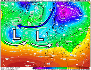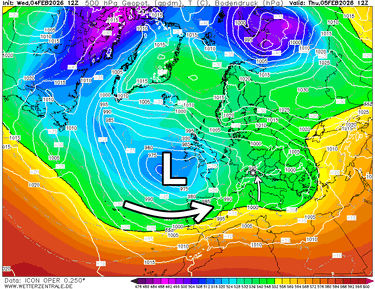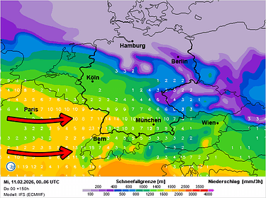Uitdiepende lagedruk bevindt zich nog steeds ten westen van Frankrijk. Aan de voorzijde staat er een zuidelijke luchtstroming die vooral in het zuidoosten van de Alpen nog enige tijd een südstau (neerslag) oplevert. Elders zorgt een tussenfase voor droog weer en meer zon. Vannacht en morgen zonaliseert het weerpatroon en krijgen de Westelijke en Noordelijke Alpen weer wat neerslag. Na een rustigere weerfase komend weekend zwengelt de straalstroom volgende week aan met mogelijk zeer veel neerslag in de Alpen. De vraag is wel hoe de sneeuwgrens daarbij zal evolueren.