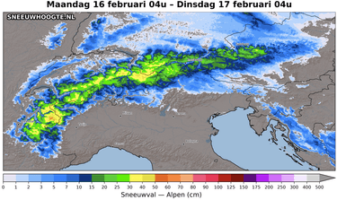 Vanavond en vannacht activeert de neerslag snel in het westen van de Alpen. Vervolgens breidt de neerslag via de noordkant uit naar het oosten, om via Zwitserland tot aan het Salzburgerland te reiken. Door de aanspannende westenwind en de wat zachtere lucht verwacht ik ook wat overgrijpende neerslag naar de zuidkant. Met andere woorden, Italiaanse gebieden dicht tegen de hoofdkam kunnen ook sneeuwbuien krijgen. De sneeuwgrens ligt eerst rond 600 m, maar stijgt in de Franse Alpen al snel tot 1200-1600 m. Tegen de ochtend verwacht ik dat de sneeuwgrens weer wat meer zakt. In de Oostelijke Alpen ligt de sneeuwgrens eerst onderin, en stijgt deze tot 800 m. Gebieden aan de zuidkant behouden de lage sneeuwgrens. Tot en met morgenochtend valt er in het westen 20-40 cm, langs de centrale noordkant 10-25 cm, en langs de oostelijke noordkant 5-10 cm. De zuidkant krijgt hoogstens centimeterwerk.