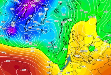 Morgen volgt er vanuit het westen een zachtere fase, Een actief lagedrukgebied, kerndruk 975 hPa, trekt van Ierland richting het noorden van Schotland. Het bijbehorende warmtefront bereikt maandagochtend het westelijke Alpengebied. Dit gaat gepaard met veel bewolking en wat regen en sneeuw. De meeste neerslag trekt zoals het er nu naar uitziet ten noorden van de Alpen langs. Maar de noordelijke Frans-Zwitserse Alpen en noordwesten van Oostenrijk moeten toch rekening houden met wat regen of sneeuw. De sneeuwgrens loopt in het westen op richting de 1500 à 1800 meter. In het oosten ligt deze met ongeveer 1500 aanvankelijk nog iets lager. Het zuidelijke Alpengebied houdt het tijdens deze fase overwegend droog. Maar ook hier gaat de vorstgrens later behoorlijk omhoog. De westelijke wind wordt helaas een vervelend aandachtspunt. Hogerop zijn dan zware windstoten mogelijk. We moeten dan ook rekening houden met liftafsluitingen. Het eerst in de Frans- west Zwitserse Alpen. Later op dag waarschijnlijk ook in Oostenrijk.