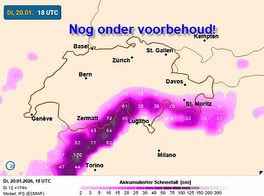 Samengevat. De sneeuwkans voor het zuidwesten neemt steeds grotere vormen aan. De noordzijde is vanwege de zuidwestelijke tot zuidelijke aanvoer duidelijk meer Wetterbegünstigt. De temperatuur ligt aan deze geografische zijde vanwege de Südfohn duidelijk hoger dan aan de koudere zuidkant!