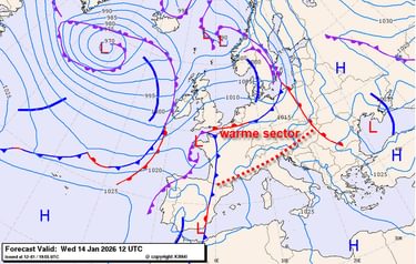 De Alpen verkeren in een imposant brede warme sector welke zich uitstrekt tussen de Spaanse oostkust helemaal tot over Polen en de Balkan. Dit levert in een groot deel van Europa behoorlijk zacht weer op. De noordzijde oogt vanwege de zuidwestelijke aanvoer vanwege föhn effecten opnieuw zachter dan het zuidelijke Alpengebied. Dan moet je van noord naar zuid op 2000 meter respectievelijk denken aan waarden van tussen de +6 en -4 graden C. In het westen schommelt de temperatuur ergens rond de -1 in de Franse Alpen tot +4 graden C voor de Zwitserse noordkant. Daarbij blijft het overwegend droog, met af en toe wat overtrekkende middelbare en hoge wolkenvelden. Uitzondering vormen de Ligurische Alpen. Hier is de bewolking wat dikker. Het kan in deze omgeving lokaal wat miezeren. Pas ergens boven de 2200 meter is hier misschien wat lichte sneeuwval mogelijk.