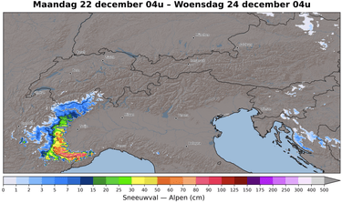 Woensdag en donderdag buldert er vanaf het oosten duidelijk koudere lucht binnen. Op het grensgebied vormt er langs de zuidkant neerslag welke ook in de Dolomieten deze keer wat sneeuw gaat opleveren. In het noordwesten van Italië staat er in deze "retour d'Est" situatie opnieuw veel neerslag. Dezelfde gebieden die vandaag en morgen sneeuw krijgen zullen dus ook woensdag en donderdag sneeuw van betekenis krijgen. Langs de noordkant koelt het woensdag en donderdag wel af, hier blijft het nagenoeg helemaal droog en wisselend bewolkt. Vrijdag, het weekend, en begin volgende week komen de Alpen terecht onder een nieuwe impuls van hogedruk. Resultaat? Zonnige en rustige condities!