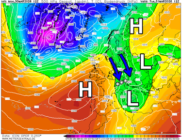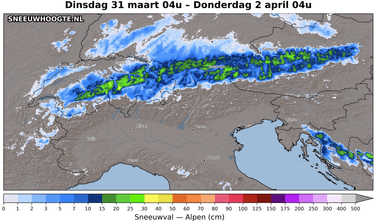 Ook vandaag nog een groot contrast tussen noord-, west- en zuidkant. Vanaf het noorden wordt er aanhoudend koude en vochtige lucht aangevoerd welke langs de Zwitserse en Oostenrijkse noordkant de hele dag voor betrokken weer en (lichte) sneeuw zorgt. De sneeuwgrens ligt eerst helemaal onderin, en stijgt na de middag tot pakweg 500-600 m. Tot en met vanavond verwacht ik in de gunstige Nordstau gebieden nog eens 10-15 cm. Dat dikt mooi aan. In de Westelijke Alpen en ook in Wallis en het zuiden van Graubünden blijft het droog, of wordt het snel droog, met eerst veel lage wolkenvelden, maar overdag stilaan meer ruimte voor de zon. Vooral na de middag klaart het hier aanzienlijk op. De zuidkant krijgt een volledig zonnige dag. Door een lichte noordföhn is de lucht hier droog en ook wat zachter. Zo schommelt de vorstgrens ten noorden van de hoofdkam rond 800-1400 m, en aan de zuidkant rond 1600-1800 m. Prima waarden voor eind maart. Wat een condities! Minpunt is de noordenwind die vandaag fors zal doorwaaien. In de bergen vaak (vrij) krachtig met op de hogere toppen en cols rukwinden tot >100 km/u. Vandaag vooral langs de Zwitsers - Italiaanse en Zwitsers - Oostenrijkse grens. Hopen dat dat niet voor problemen zorgt.