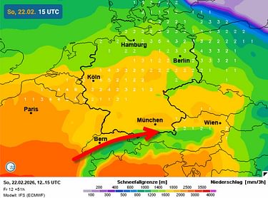 Zondag vallen op een volgend warmtefront rond de Bayerische Alpen en Oostenrijkse noordkant enkele buien. Ik zeg dan bewust buien, want de sneeuwgrens doet met ongeveer 1300 tot 1800 meter duidelijk nog een stapje verder omhoog. Zoals het er nu naar uitziet zijn de buien het meest actief rond de Salzburger Alpen en verder oostwaarts. Met een beetje geluk houdt de Arlberg en Tirol het dan droog, want op regen zitten we niet te wachten natuurlijk. Rond de Dolomieten blijft het eveneens droog met aardig wat ruimte voor de zon.