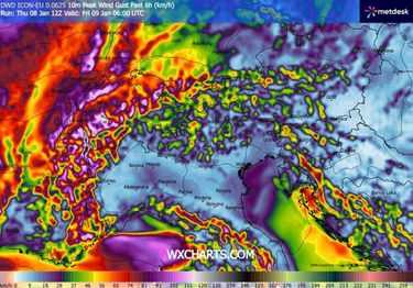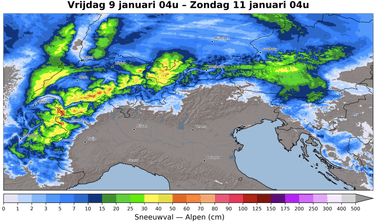 Na een turbulente nacht met veel neerslag een tijdelijk stijgende sneeuwgrens, vooral in het westen, stroomt er vanmorgen weer koudere lucht uit over de Alpen. Langs de hele noordzijde zorgt de opstuwing hiervan voor veel bewolking en sneeuwbuien. Ten zuiden van de hoofdkam is het droog met opklaringen en wolkenvelden, al maken de gebieden dicht tegen de hoofdkam ook wel kans op buien. Overdag staat er een storm(achtige) wind uit het west-noordwesten die vooral in de Westelijke en Noordwestelijke Alpen stevige sneeuwbuien doet ontstaan. Meer naar het oosten is het vaak droog, en kan de zon er tussendoor wel eens doorkomen. De zuidkant houdt het overdag droog met zon en wolkenvelden, behalve dicht tegen de hoofdkam waar overgrijpende sneeuwbuien mogelijk zijn. Vooral in het westen en noorden van Aosta kunnen er meer buien vallen. De sneeuwgrens ligt vanmorgen tussen 800 en 1200 m, maar zakt overdag tot helemaal onderin. De aangevoerde lucht wordt immers terug een pak kouder. Voor wie vanavond al naar de Alpen vertrekt, houd rekening met sneeuwbuien in de Ardennen en in Duitsland. Hoofdrolspeler zal vandaag ook de wind zijn. Het gaat namelijk vrij krachtig tot stormachtig waaien, met rukwinden tot 100-140 km/u langs de westelijke en centrale hoofdkam en mogelijk zelfs nog meer. Meer naar het oosten komen rukwinden voor tot 80-100 km/u. Ongetwijfeld leidt dit tot veel liftafsluitingen. Storm Goretti houdt dus ook lelijk huis in de Alpen. De verse sneeuw zal daardoor ook sterk verwaaien en er kunnen duinen gevormd worden. In de Westelijke en Noordwestelijke Alpen valt er vandaag 10-25 cm sneeuw bij, meer naar het oosten is dat 0-10 cm (afhankelijk van de buien).