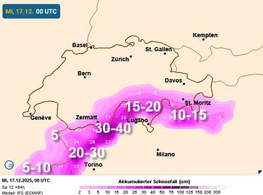 Maandag gaan de mooiste kantjes er in het westen langzaam vanaf. Een hoogtestoring boven Spanje krijgt langzaam wat meer invloed op het zuidwestelijke Alpengebied. Het raakt daardoor in deze hoek wat meer bewolkt. In de nacht van maandag op dinsdag wordt de bewolking vanuit het zuidwesten steeds dikker en actiever. Ik verwacht later in de nacht de eerste regen en sneeuw rond de Seealpen. Deze breidt zich vervolgens snel verder naar de westelijke zuidzijde uit. Stuwing zorgt vervolgens voor een sneeuwimpuls. Rond Zermatt valt hoogstwaarschijnlijk de meeste sneeuw. Hier verwacht ECMWF lokaal zelfs tegen gunstig gelegen stauhellingen een mooie 40cm. Let op. Dit kan in de volgende runs nog wat veranderen. Maar het signaal ziet er de laatste runs vrij consequent uit. De sneeuwgrens ligt naar verwachting ergens tussen de 1100 en 1500 meter. De wind wordt tijdens deze fase wel een hinderlijke factor. Vooral hogerop verwacht ik een harde tot zelfs stormachtig toenemende zuidoostelijke wind! Dit leidt dan ongetwijfeld tot liftafsluitingen. Oostenrijk kijkt ondertussen vrij lijdzaam toe. Misschien komt het op woensdag in het uiterste zuidwesten tot wat lichte sneeuwval, maar veel zal het zeker niet zijn. Het zwaartepunt van de sneeuwval ligt duidelijk verder naar het westen.
