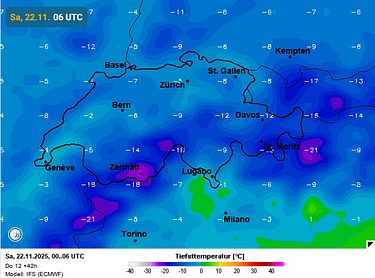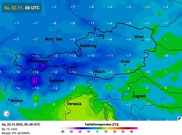 Vandaag hebben de Alpen te maken met 2 verschillende luchtstromingen. De noordzijde heeft te maken met de aanvoer van zeer koude lucht vanuit Oost-Europa. De zuidelijke Alpen liggen meer onder invloed van een depressie boven de centrale Middellandse Zee. Deze luchtsoort is tegelijkertijd erg vochtig. De lucht stroomt in een cyclonaal patroon (tegen de wijzers van de klok) met een oostelijke wind over de oostelijke en centrale zuidzijde. Er vallen hierdoor over het gehele Alpengebied talrijke sneeuwbuien. Rond de noordzijde ligt de sneeuwgrens tot diep in het dal. Ten zuiden van de hoofdkam ligt deze met ongeveer 900 à 1100 meter wat hoger. Dit levert voor de noordzijde en inner Alpines tot en met vrijdagnacht ongeveer 10 tot 20cm sneeuw op. Misschien is rond de Hohe Tauern zelfs 30 cm mogelijk. In het westen verwacht ik van de Savoie tot aan de Zwitserse noordzijde eveneens een mooi 15 tot 30cm. Wat de temperatuur betreft hebben we een luxe probleem. Het vriest op 2000m namelijk gemiddeld tussen 8 en 12 graden. Dat zijn met recht zeer lage temperaturen voor de tijd van het jaar!