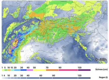 Morgen staat er een strakke ZW-circualtie. Daarbij valt er in eerste instantie vooral neerslag in de Westelijke Alpen terwijl er in de Oostelijke Alpen nog opklaringen voorkomen. Na de middag verwacht ik ook in het zuidoosten, door een zwakke ZW-stau, oplevende neerslag. 's Avonds en tijdens de nacht op dinsdag draait de wind dan meer naar het westen en noordwesten en breidt de neerslag zich via de noordkant uit naar Oostenrijk. Tegelijk wordt de aangevoerde lucht dan ook weer markant kouder. Het grootste deel van morgen pendelt de sneeuwgrens tussen 1400 en 1600 m. Morgenavond en tijdens de nacht op dinsdag daalt de sneeuwgrens weet tot 600-800 m, waardoor het opnieuw tot onderin wit kan worden. Een nieuwe impuls van de winter! Tegen dinsdagochtend krijgen de Westelijke Alpen nogmaals 30-70 cm. Hier kan dus echt veel sneeuw vallen. Het westen van Zwitserland mag er er 20-40 cm bijtellen, terwijl er in de Oostelijke en Zuidoostelijke Alpen tot en met dinsdagochtend 10-20 cm kan vallen. Mooie sneeuwsommen!