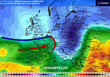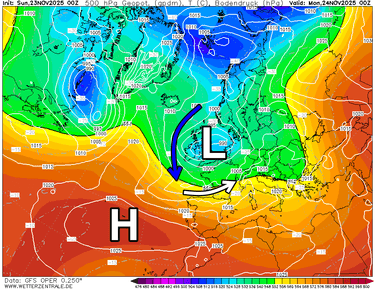 Vanmorgen is het droog in de Alpen. In het oosten is het nog helemaal zonnig, in het westen komen er al wat meer middelhoge wolkenvelden voor. In de loop van de dag zal de bewolking vanaf het westen uit verder verdichten, en zich stilaan ook uitbreiden naar het oosten. Het blijft nog wel lange tijd droog. De vorstgrens ligt tussen 500 m in het oosten en 2000 m in het westen. Pas vanavond, na zonsondergang, arriveert de eerste neerslag in de Franse Alpen. Vannacht zal de neerslag zich dan langs de westkant uitbreiden naar het zuiden, en via de noordkant tot aan de Zwitsers/Oostenrijkse grens. Elders blijft het nog droog. Er buldert beduidend zachtere lucht naar de Alpen, maar door het blijven plakken van de zwaardere lucht tegen de Alpen, en het proces van isothermie (neerslagafkoeling) verwacht ik dat de sneeuwgrens op de meeste plaatsen wel tussen 1200 en 1600 m blijft schommelen. Tegen morgenochtend valt er in de Westelijke Alpen 20-40 cm. In het noorden en zuidwesten is dat eerder 10-20 cm.