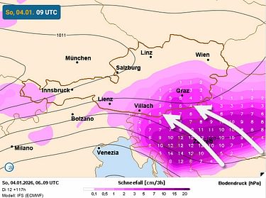 Zondag zijn alle ogen gericht op het zuidoostelijke Alpengebied. Een storing boven de Balkan zorgt dan met een zuidoostelijke wind voor een flinke sneeuwimpuls richting de Venetianer Alpen en Oostenrijkse zuidzijde. Volgens de laatste prognoses behoort een halve meter sneeuw voor de zuidelijke Steiermark en oosten van Karinthië tot de mogelijkheden. We moeten even in de gaten houden hoe deze situatie zich verder ontwikkelt. Storingen in deze hoek van de Alpen kunnen zich namelijk nogal grillig gedragen.