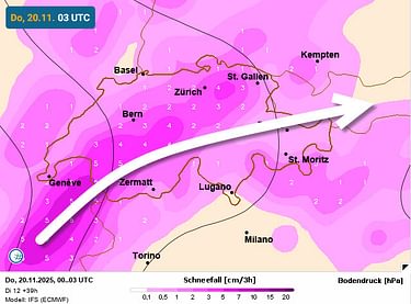 Donderdagochtend bereikt een koufront met nog wat koudere lucht de Franse Alpen. Dit gaat gepaard met opkomende sneeuwval en een verder dalende sneeuwgrens. Deze duikt dan naar ongeveer 600 à 800 meter. Dat is voor deze tijd van het jaar behoorlijk laag. De sneeuwval trekt overdag snel verder oostwaarts en beslaat zowel de noord als deels ook de zuidzijde. Er valt dan gemiddeld tussen de 10 en 25cm verse sneeuw. Alleen de zuidelijke Franse Alpen en de Cottische / Ligurische Alpen ontsnappen aan de sneeuwdans. Deze omgeving ligt naar verwachting net buiten bereik van de frontale sneeuwval.
