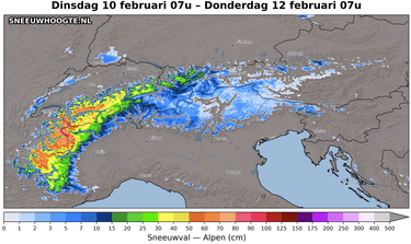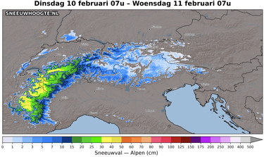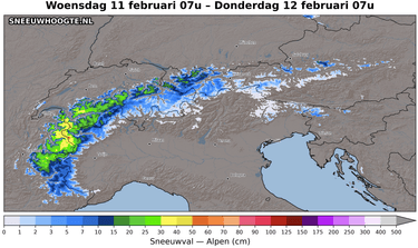 Na een tijdelijk droge episode deze namiddag zal vanavond dan een actief warmtefront in de Franse Alpen arriveren. Aanvankelijk ligt de sneeuwgrens dan nog rond 1400 m, maar vanavond en vannacht zal er met een storm(achtige) westenwind snel zachtere lucht worden aangevoerd. De sneeuwgrens stijgt dan snel tot 1800-2000 m, om tegen de ochtend terug te zakken tot 1500-1600 m. Door de sterke wind verwacht ik dat de neerslag zich ook via de noord- en zuidkant naar het oosten zal uitbreiden, maar het is wel duidelijk dat de hoogste activiteit in het westen zal plaatsvinden. Ten zuiden van de hoofdkam blijft een koude plaklaag aanwezig met daardoor een sneeuwgrens rond 800-1000 m. Aan de noordkant gaat de sneeuwgrens ook in Zwitserland omhoog tot 1400-1800 m. In Oostenrijk lijken de blootgestelde gebieden een sneeuwgrens rond 1400 m te krijgen, terwijl het inner-alpien lager sneeuwt, vanaf ongeveer 1000 m. Tot en met morgenochtend valt er in het westen 30-50 cm op 2000 m. Daaronder zal regen het sneeuwpak helaas ook flink beïnvloeden. Het westen van Zwitserland krijgt 20-40 cm. Het oosten van Zwitserland en het westen van Oostenrijk moeten het wellicht stellen met 5-10 cm. In de Dolomieten valt 2-10 cm. Let op, deze hoeveelheden zijn allemaal indicatief. Het is onmogelijk om precieze hoeveelheden aan te geven vermits dit afhangt van wind, vallei-oriëntatie en vooral ook de sneeuwgrens!