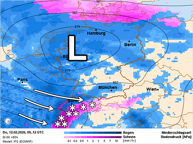 Tijdens de nacht op donderdag arriveert er alweer een nieuw warmtefront in het westen, deze keer wel snel opgevolgd door een koufront. Na een tijdelijk klim van de sneeuwgrens richting 1600-1800 m, zakt deze tegen donderdagochtend tot 1000-1200 m. Donderdag overdag is het in het westen langdurig betrokken met vaak matige tot hevige sneeuwval vanaf 1000-1200 m. In het oosten is het eerst droog met opklaringen, vooraleer de neerslag donderdagnamiddag ook het noordoosten bereikt. De stevige westenwind zal daarbij een handje helpen. Langs de zuidkant blijft het droog met een mix van zon en wolkenvelden. De vorstgrens ligt hier rond 2000 m. Tijdens de nacht op vrijdag blijft het langs de west- en noordkant betrokken met sneeuwbuien. Daarbij verplaatst de meeste intensiteit zich stilaan naar het oosten. De sneeuwgrens daalt dan nog een beetje tot 800-1000 m. Cumulatief verwacht ik bij deze fase opnieuw 30-50 cm in het westen en 10-20 cm elders langs de noordkant.