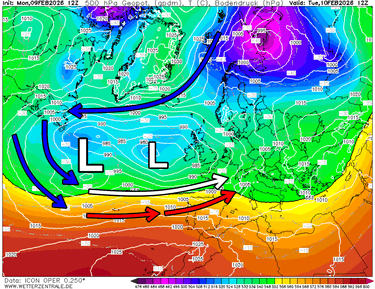 Vrijdag overdag stabiliseert het weerbeeld tijdelijk met overal droog weer en meer ruimte voor de zon. Tijdens de nacht op zaterdag koerst er dan een volgende depressie over Frankrijk naar Italië, wat een trekpaard zal vormen voor polaire lucht. Deze botst zaterdag vanaf N-NO op de Alpen met dan sneeuwval tot helemaal onderin. Dat is een uitstekend begin voor de voorjaarsvakantie, maar de timing is niet ideaal.
