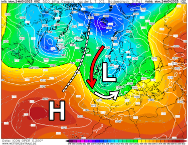 De Alpen liggen onder de invloed van een lagedrukgebied boven de Noordzee. Aan de zuidkant hiervan staat er een ZW-NO georiënteerde tak van de straalstroom gericht op de Westelijke Alpen. Deze regio krijgt daardoor langdurige stuwingsneerslag met gematigde temperaturen. Komende dagen verplaatst het lagedrukgebied zich naar het oosten waardoor de wind in de Alpen weer naar het noorden draait en het opnieuw afkoelt.