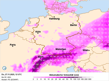 Een intense ZW-stuwing zal vandaag vervolgens de hele dag voor felle neerslag zorgen in de Franse Alpen, Aosta-regio (overgrijpend) en het (noord)westen van Zwitserland. Na de middag verwacht ik ook in het zuidoosten (Dolomieten) vorming van neerslag. Elders is het vaak bewolkt, maar door de föhn (dalende luchtbeweging aan lijzijde van de bergen) kunnen er ook opklaringen ontstaan. De sneeuwgrens zal vandaag min of meer gelijk blijven aan die van deze ochtend, met gemiddeld 1600 m in het westen en 1200 m in het noorden. De neerslag in het zuidoosten (Italië) valt onder vaste vorm vanaf 600-800 m omdat hier nog een zone met koudere lucht blijft plakken. Hoeveel neerslag kan er dan vallen vandaag? In het westen is 30-50 cm sneeuw mogelijk (boven 1600 m), in het westen van Zwitserland 15-30 cm, elders 5-15 cm of blijft het droog. Er staat een forse ZW-wind (tot stormachtig in de bergen) met rukwinden op de collen en toppen tot meer dan 100 km/u. Geen pretje dus vandaag in het hooggebergte.