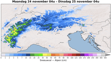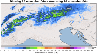 Vanavond en vannacht draait de wind dan naar het westen en later noordwesten waardoor de neerslag zich uitbreidt via de noordkant naar het oosten. Ook in Trentino/Lombardije verwacht ik dan oplevende neerslag. Samen met deze windrotatie stroomt er vannacht weer koudere lucht binnen waardoor de sneeuwgrens zakt tot 500-800 m. Morgen overdag blijft de hele noordkant gevoelig voor buien die ontstaan door de opstuwing van polaire lucht tegen de bergen. Met 500-600 m ligt de sneeuwgrens onderin. Zalig! Opnieuw wit tot in de valleien. De zuidkant geniet morgen aan de lijzijde van neerslagschaduw. Hier klaart het helemaal op en stijgt de vorstgrens geholpen door een NW-föhn tot 1600-1700 m. Langs de noordkant kan er morgen 10-20 cm sneeuw vallen, lokaal tot 30 cm in de gunstige stau-gebieden.