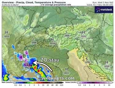 Het drukpatroon verandert dezer dagen weinig, en dus is het weerbeeld ook zeer gelijkaardig. We starten in de bergen zonnig, terwijl er langs de noordkant wel veel hochnebel voorkomt. Het is zeker in de koudegaten vanochtend wel koud met bijvoorbeeld -10°C in Buffalora (ZO-Zwitserland). In de loop van de dag lost de hochnebel op, maar er worden dan vanaf het westen wel stilaan wat meer hoge en middelhoge wolkenvelden aangevoerd, door een toename van de vochtigheid in de hogere luchtlagen. In het oosten merken we hier weinig van. Hier blijft het volledig zonnig. De temperaturen dalen een beetje, maar met een stevige Z-ZO wind in het zadel blijft de aangevoerde lucht zacht en ligt de vorstgrens rond 3300 m in het zuidwesten en 3700 m in het oosten.
