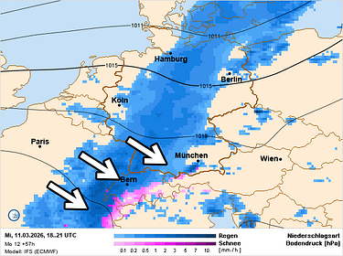 Donderdag verwacht ik in de Oostelijke Alpen nog een hele tijd veel bewolking en wat neerslag, vooral in Vorarlberg, bij een sneeuwgrens rond 800-1000 m. In de loop van de dag wordt het dan wel droger met ook opklaringen. Elders in de Alpen, en zeker langs de west- en zuidkant, klaar het donderdag al snel op en wordt het een vrij zonnige dag. Vrijdag blijft het droog met veel ruimte voor de zon. Aan de zuidkant kunnen er nog wat meer hardnekkige wolkenvelden voorkomen. Aan de voorzijde van een nieuwe koufront lopen de temperaturen hoog op. Op 1500 m wordt het ca. 5-10°C, dus de vorstgrens ligt tussen 2300 en 2800 m. Dat is vrij hoog. Tijdens de nacht op zaterdag en zaterdag overdag gaat het dan vanaf het westen uit intens sneeuwen. Eerst ligt de sneeuwgrens rond 1000 m, maar die zakt al snel tot 500 m. De neerslag breidt zich via de noordkant uit naar het oosten. Zaterdag overdag evolueert de neerslag zich meer in een Südstau met dan langdurige neerslag langs de zuidkant. Cumulatief verwacht ik tot en met zondagochtend op veel plaatsen 10-20 cm sneeuw, regionaal nog meer (vooral langs de centrale zuidkant). Maandag volgt wellicht alweer een volgende sneeuwzone vanaf het westen. En zo bulderen we terug meer de winter in! Morgen praat Michael jullie weer bij :) Fijne dag.